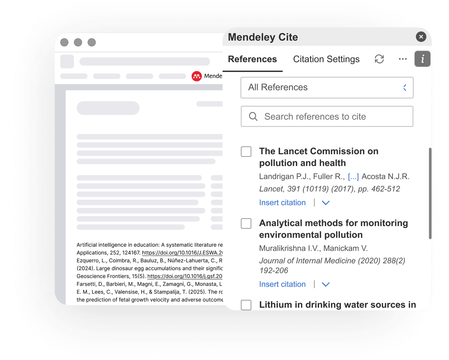 Get Mendeley CiteBeing able to work seamlessly is vital to you. So, as well as searching your Mendeley library and inserting individual or multiple references and bibliographies in just a few clicks, with Mendeley Cite you can: